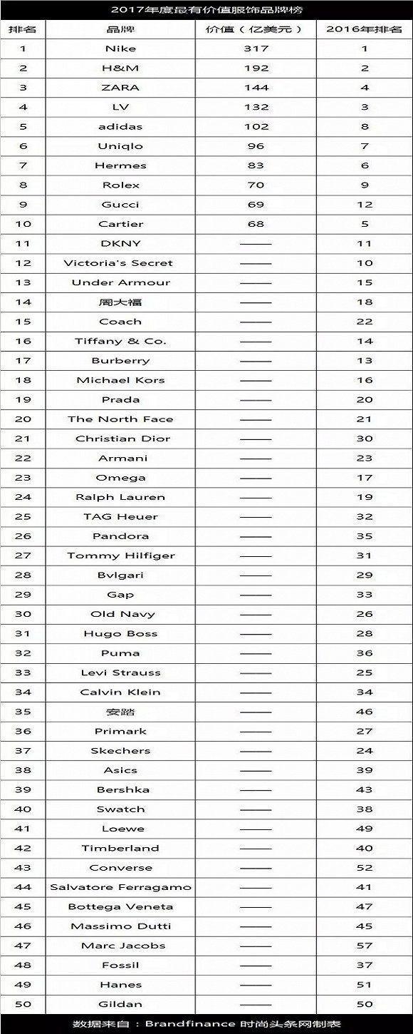 以下是Brand Finance《2017全球最有價值服飾品牌榜》50強名單: