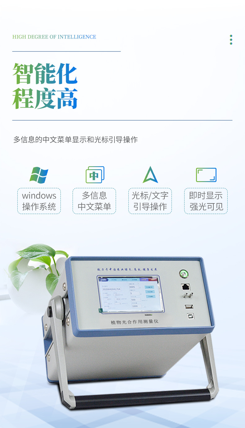 智能化:采用windows 操作系統(tǒng),觸摸顯示屏。多信息的中文菜單顯示和文字引導(dǎo)操作,即時(shí)將測(cè)定過(guò)程及最終結(jié)果屏幕顯示、存儲(chǔ)。并可顯示Pn曲線、Tr曲線、光-光合曲線以及濕度-蒸騰曲線;
