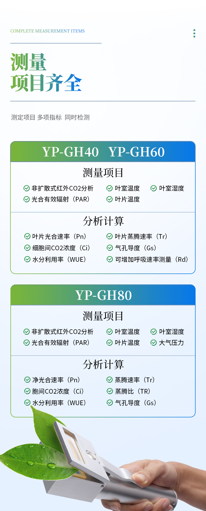 YP-GH80植物光合測(cè)量系統(tǒng)可以測(cè)定氣體CO2濃度、空氣溫濕度,葉片溫度,光合有效輻射,細(xì)胞間CO2濃度,氣體流量等要素,并計(jì)算出植物的光合速率、蒸騰速率、氣孔導(dǎo)度、胞間二氧化碳濃度和水分利用率等光合作用指標(biāo),也可以單獨(dú)作為二氧化碳記錄儀使用。FS-3080H植物光合測(cè)量系統(tǒng)采用windows 操作系統(tǒng),觸摸顯示屏,可顯示、保存及導(dǎo)出Pn曲線、Tr曲線、光-光合曲線以及濕度-蒸騰曲線。廣泛應(yīng)用農(nóng)學(xué)、林學(xué)、生態(tài)學(xué)、農(nóng)業(yè)氣象學(xué)等學(xué)科的科學(xué)研究。