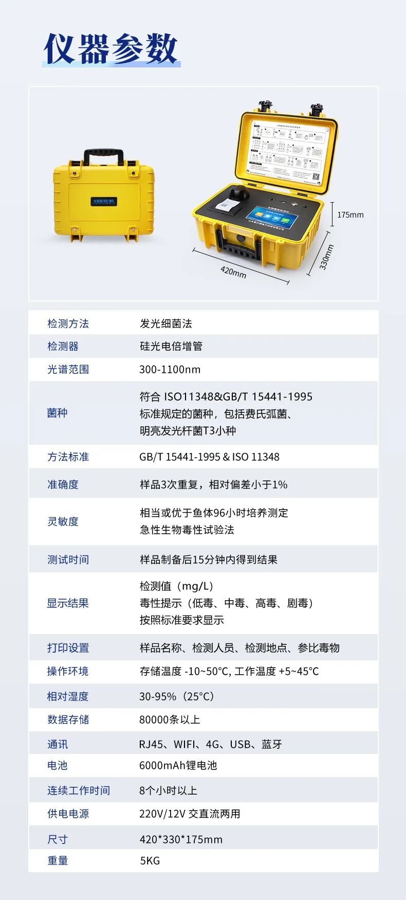 便攜式生物毒性檢測(cè)儀可用于現(xiàn)場(chǎng)水中重金屬、毒劑、神經(jīng)毒劑、農(nóng)藥制劑等物質(zhì)總體毒性檢測(cè),符合國(guó)標(biāo)“GB/T15441-1995水質(zhì)急性毒性的測(cè)定—發(fā)光細(xì)菌法”和國(guó)際標(biāo)準(zhǔn)(ISO11348-3)。
